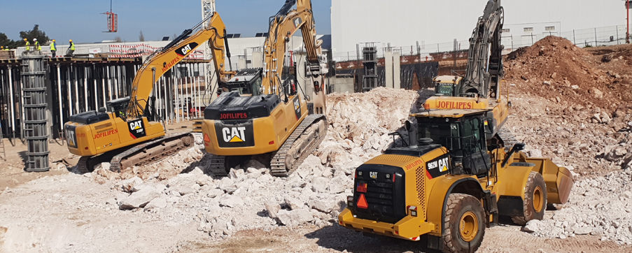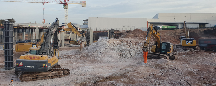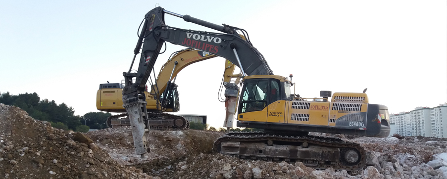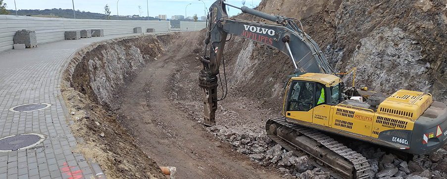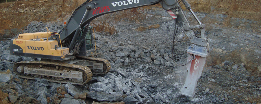 Para o desmonte de rocha recorrendo a giratórias escavadoras, dispomos de martelos hidráulicos, e rippers acoplados a todas a giratórias até 52 toneladas. Recorrendo ao bulldozer com capacidade de ripar pedra com o peso até 40 toneladas.